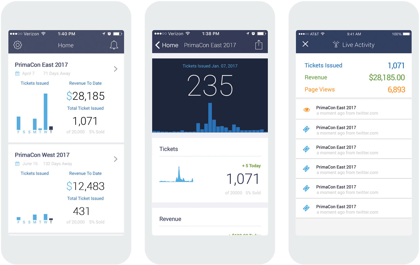 Real-Time gives you real-time sales data on you iOS device. Compare sales across multiple events, from various marketing sources and watch a live sales feed as your ticket sales take place.