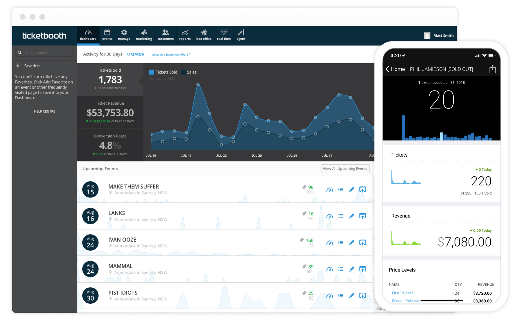 Ticketbooth provides you with all the tools you need to process secure online ticket sales, with event pages designed to make the ticket purchase process simple on all devices backed by powerful cloud based infrastructure and constantly tested security.