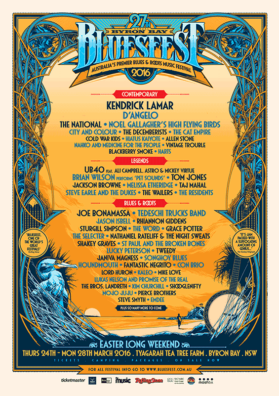 Bluesfest presents the biggest names in music to Australian audiences each year including Bob Dylan, Hozier, Paul Simon, Gary Clark Jr., Angus & Julia Stone, Robert Plant, Alabama Shakes, John Mayer, Jurassic 5, James Brown, Zac Brown Band, Joss Stone, David Gray, Trombone Shorty, Angelique Kidjo, John Legend & BB King, to name but a few.